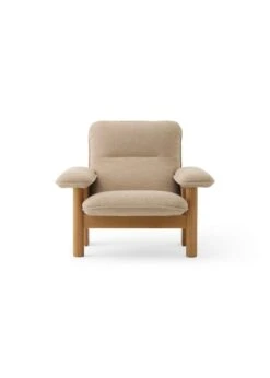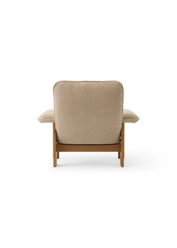 Der Brasilia-Loungesessel von Menu besticht durch sein organisches Aussehen und seine weichen Linien. Der von Anderssen & Voll designte Brasilia-Loungesessel besteht aus einem Gestell aus Massivholz, das in traditioneller Tischlerarbeit hergestellt wurde, sowie einer gepolsterten Sitzfläche und gepolsterten Armlehnen. Die Kombination aus runden Vorderbeinen und eckigen Hinterbeinen verleiht dem Sessel eine schöne geometrische Note.