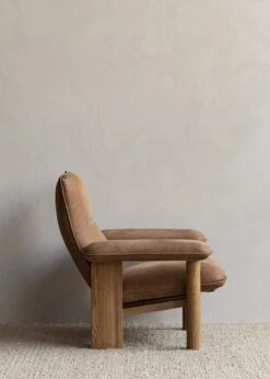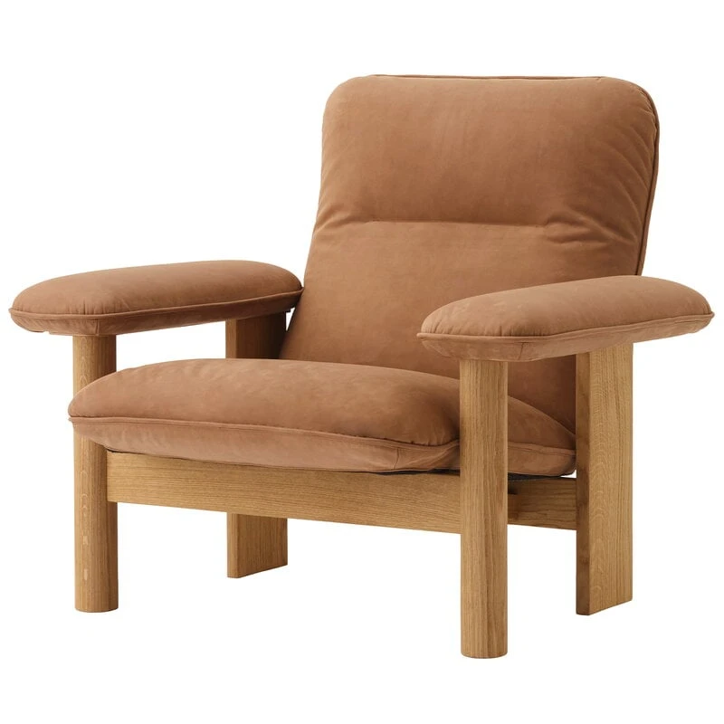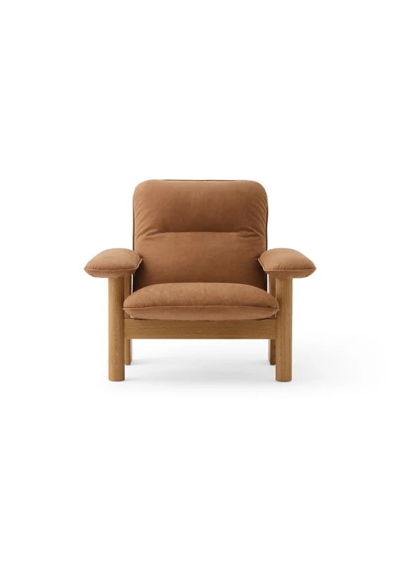 Der Brasilia-Loungesessel von Menu besticht durch sein organisches Aussehen und seine weichen Linien. Der von Anderssen & Voll designte Brasilia-Loungesessel besteht aus einem Gestell aus Massivholz, das in traditioneller Tischlerarbeit hergestellt wurde, sowie einer gepolsterten Sitzfläche und gepolsterten Armlehnen. Die Kombination aus runden Vorderbeinen und eckigen Hinterbeinen verleiht dem Sessel eine schöne geometrische Note.Â