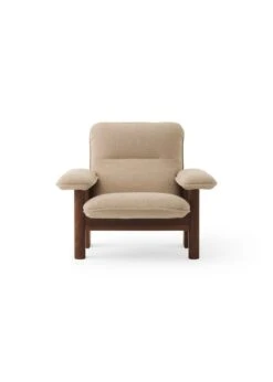 Der Brasilia-Loungesessel von Menu besticht durch sein organisches Aussehen und seine weichen Linien. Der von Anderssen & Voll designte Brasilia-Loungesessel besteht aus einem Gestell aus Massivholz, das in traditioneller Tischlerarbeit hergestellt wurde, sowie einer gepolsterten Sitzfläche und gepolsterten Armlehnen. Die Kombination aus runden Vorderbeinen und eckigen Hinterbeinen verleiht dem Sessel eine schöne geometrische Note.