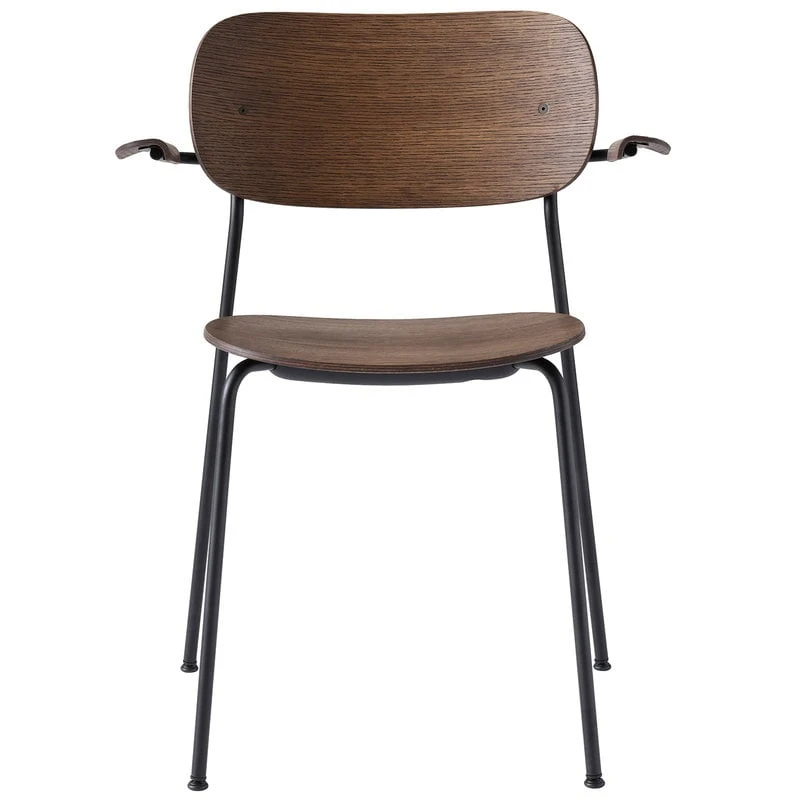 Menus Co Chair zeichnet sich durch einen ausgewogenen Kontrast zwischen einem schlanken Stahlrohrgestell und einer sanft geschwungenen Holzsitzfläche aus. Die leicht geneigte Rückenlehne sorgt für optimalen Sitzkomfort und Halt. Die Armlehnen aus Eichenfurnier runden das Design ab.