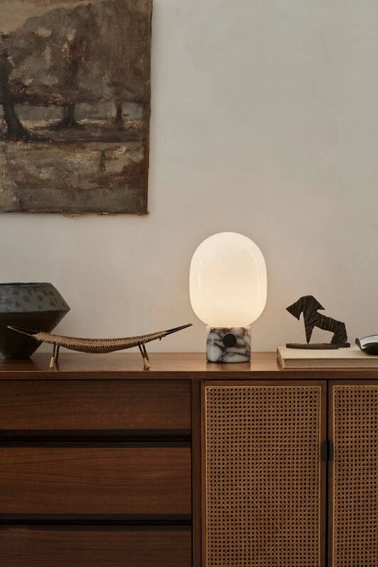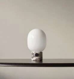 Die JWDA-Tischleuchte von MENU ist eine reizvolle, elegante und kompakte Leuchte mit einem Sockel aus Stahl, einem runden Opalglas-Schirm und einem Drehknopf, der als Schalter und Dimmer dient. Die von Jonas Wagell entworfene zeitgenössische Tischleuchte wurde von der Ausstrahlung traditioneller Öllampen inspiriert. Die JWDA-Leuchte beleuchtet jeden Raum mit sanftem Licht und macht sich auch auf Ihrem Couch- oder Nachttisch gut.
