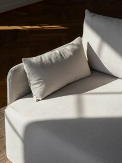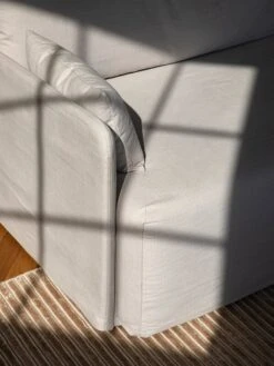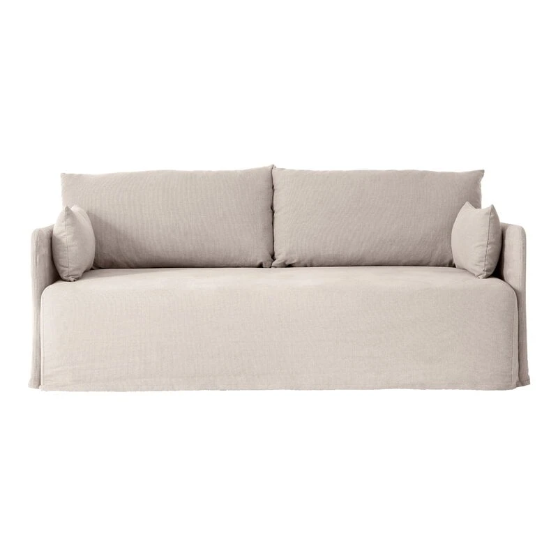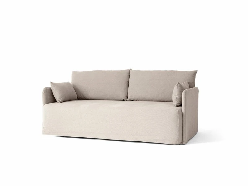 Das Offset-2-Sitzer-Sofa wird mit einem abnehmbaren und waschbaren losen Bezug geliefert. Sie können die Lebensdauer des Sofas verlängern, indem Sie einen verschlissenen Bezug durch einen neuen ersetzen, und mit einem zusätzlichen Bezug können Sie das Aussehen des Sofas verändern, wann immer Ihnen danach ist. Der Bezugsstoff besteht aus einem schönen und strapazierfähigen Baumwoll-Leinen-Gemisch, die weichen Kissen sind mit Federn und Schaumstoffgranulat gefüllt.