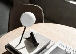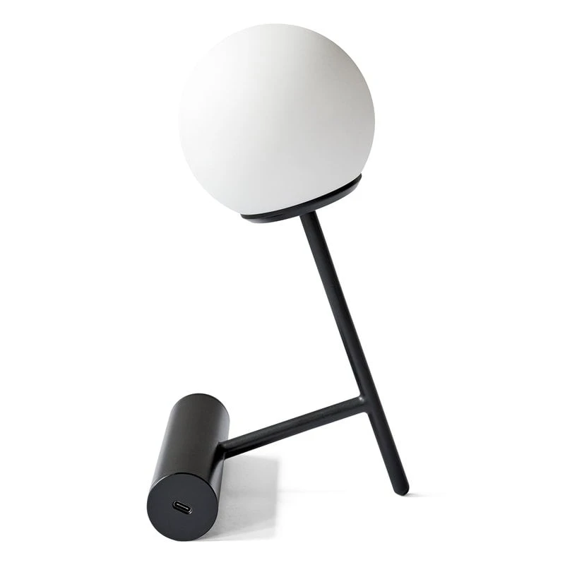 Menus Leuchte Phare wurde von Stanislaw Czarnocki entworfen und ist eine kabellose, leicht tragbare Tischleuchte, deren geometrisches Design einen kugelförmigen Diffusor und einen diagonalen Metallsockel miteinander kombiniert. Die eingebaute LED-Einheit der Leuchte Phare wird mit einem Akku betrieben und spendet ein sanftes Licht, das durch den opaken Schirm diffundiert.