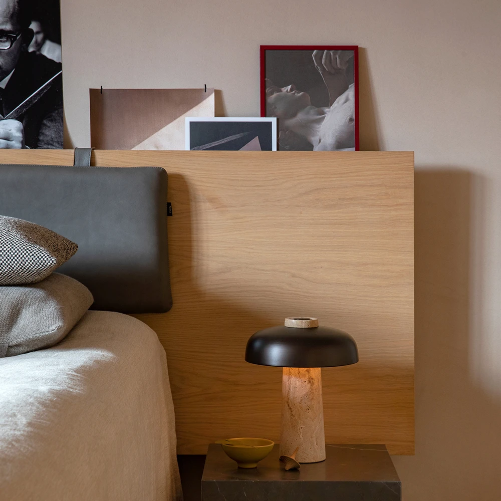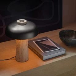 Die Reverse Tischleuchte der dänischen Marke Menu hat einen abgerundeten Leuchtenschirm aus Metall und einen Sockel aus unverarbeitetem Naturstein mit einer Form, die an einen Kegel erinnert. Dank des natürlichen Materials des Fußes erscheinen beim Aufleuchten der Lampe dekorative Schatten. Wo sich Sockel und Leuchtenschirm am oberen Teil der Leuchte treffen, befindet sich ein Dimmer, mit dem man die Lichtintensität und die Farbtemperatur gleichzeitig einstellen kann. Das bedeutet, dass die Lampe viele verschiedene Beleuchtungsbedürfnisse erfüllt – alles von warmem Licht auf dem Nachttisch bis hin zu einem gedämpften Licht für den Schreibtisch.