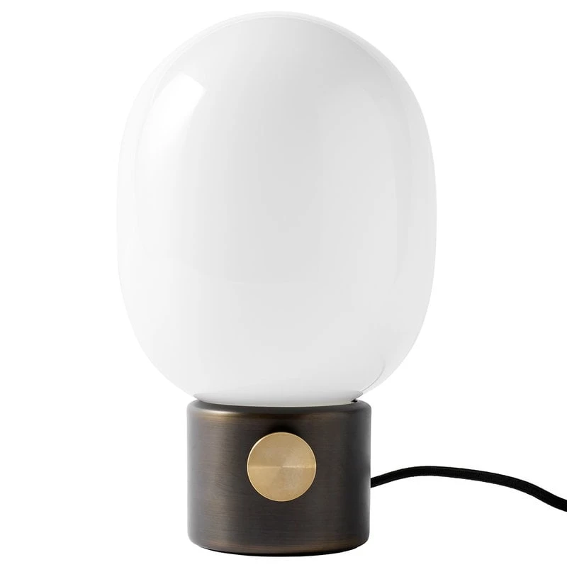 Die Tischleuchte JWDA von Menu ist eine reizvolle, elegante und kompakte Leuchte mit einem Sockel aus brüniertem Messing, einem runden Opalglas-Schirm und einem Drehknopf, der als Schalter und Dimmer dient. Die von Jonas Wagell entworfene zeitgenössische Tischleuchte wurde von der Ausstrahlung traditioneller Öllampen inspiriert. Die JWDA beleuchtet jeden Raum sanft und macht sich auch auf Ihrem Nacht- oder Sofatisch gut.
