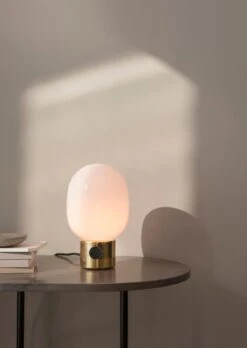 Die JWDA-Tischleuchte von Menu ist eine reizvolle, elegante und kompakte Leuchte mit einem Sockel aus Messing, einem runden Opalglas-Schirm und einem Drehknopf, der als Schalter und Dimmer dient. Die von Jonas Wagell entworfene zeitgenössische Tischleuchte wurde von der Ausstrahlung traditioneller Öllampen inspiriert. Die JWDA beleuchtet jeden Raum sanft und macht sich auch auf Ihrem Nacht- oder Sofatisch gut.
