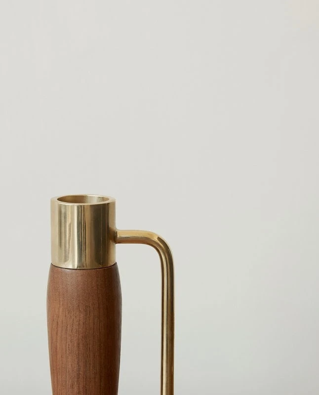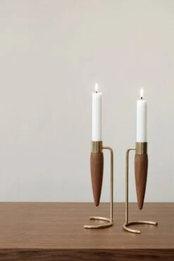Der Umanoff-Kerzenhalter von Menu ist ein elegantes und zeitloses Dekorationselement. Der von Arthur Umanoff entworfene Kerzenhalter ist aus schönem Walnussholz und poliertem Messing gefertigt, das mit der Zeit auf einzigartige und schöne Weise patiniert. Der Kerzenhalter ist für eine einzelne Kerze konzipiert und schafft stimmungsvolle Wärme auf einem Tisch oder einer Fensterbank.