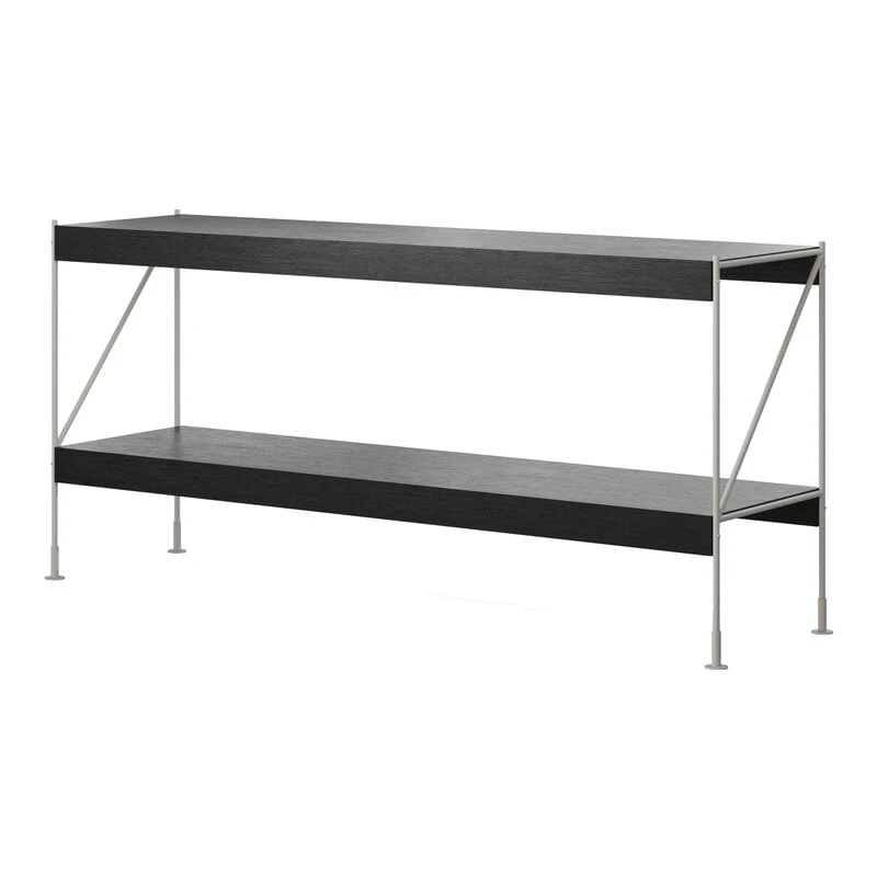 Das H70-Regal ist niedrig und verfügt über zwei Ebenen – ideal als Ablage- oder Beistelltisch im Wohnzimmer oder Flur. Der Name H70 bezieht sich auf die Höhe des Regals: 70 cm. Das Regal kann mit einer Rückwand oder einem Zeitschriftenständer vervollständigt werden.